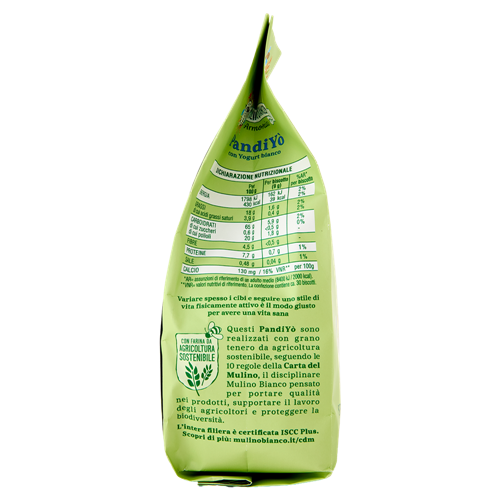 Questi PandiYò sono realizzati con grano tenero da agricoltura sostenibile, seguendo le 10 regole della Carta del Mulino, il disciplinare Mulino Bianco pensato per portare qualità nei prodotti, supportare il lavoro degli agricoltori e proteggere la biodiversità.