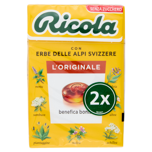 Ricola L'Originale senza zucchero, con le 13 erbe originali delle Alpi svizzere, è apprezzata da sempre per il gusto aromatico e le proprietà benefiche. Contiene 3,5 mg di mentolo per aiutare a calmare la gola e dare sollievo.