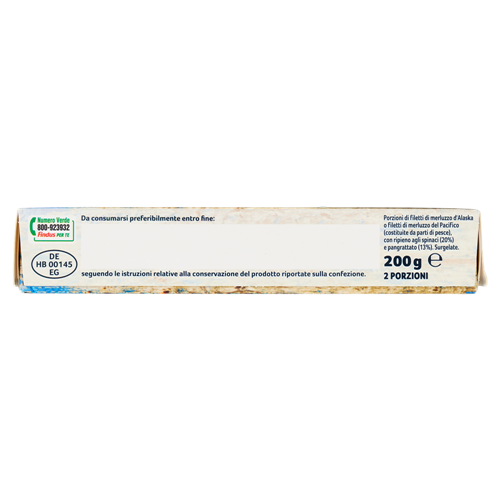 Origine: *Guarda le lettere impresse accanto alla scadenza e scopri la provenienza del pesce all'interno della confezione: A: Merluzzo d'Alaska - Theragra chalcogramma - pescato nell'Oceano Pacifico del Nord Ovest e/o del Nordt Est | DP: Merluzzo del Pacifico - Merluccius productus - pescato nell'Oceano Pacifico del Nord Est Zona di pesca; DE HB 00145 EG Bollo CE; Con 100% spinaci italiani Origine Altro Testo;