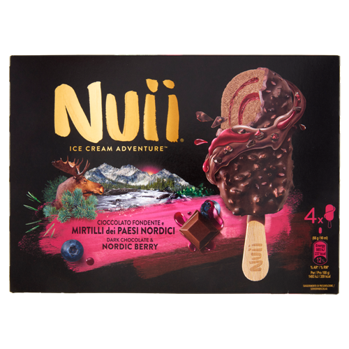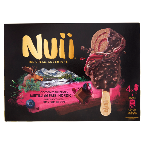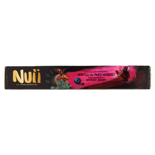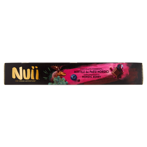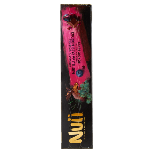 Crema gelato al cioccolato con variegatura ai mirtilli dei Paesi Nordici (6 %), ricoperto di cioccolato fondente con granella di fave di cacao (1,5 %) e pezzi di mirtilli dei Paesi Nordici (0,5 %)