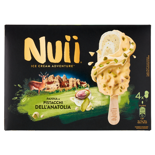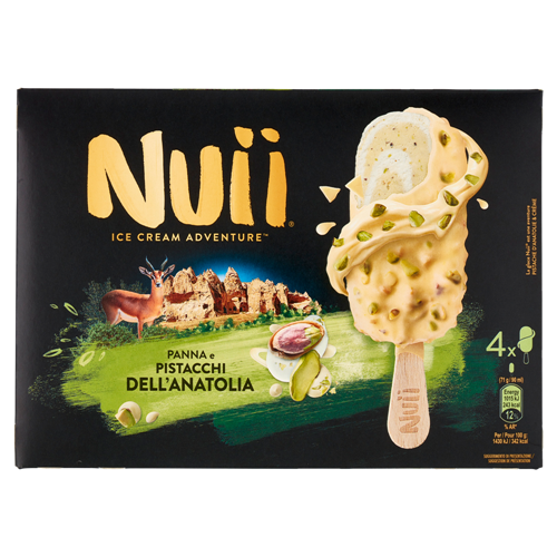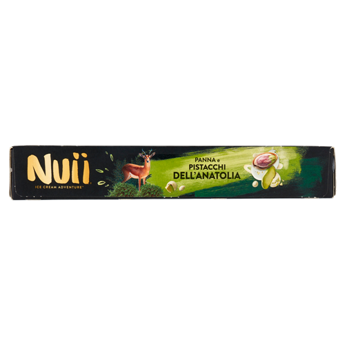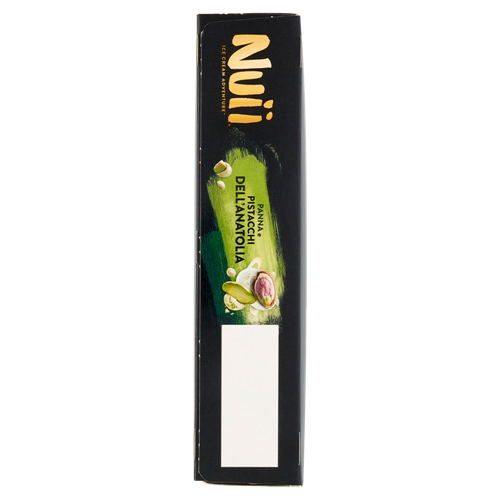 Gelato al pistacchio dell'Anatolia variegato con gelato alla panna, ricoperto di cioccolato bianco (30 %) con granella di pistacchio tostato dell'Anatolia (2,5 %) e pezzetti di wafer salati (1,2 %)