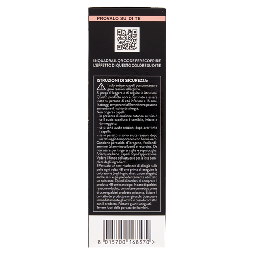 Effettuare un test rivelatore di allergia sulla pelle ogni volta 48 ore prima di eseguire la colorazione (vedi foglio di istruzioni allegato) anche se si è già precedentemente utilizzato un colorante. Quindi ricordarsi di comprare il prodotto 48 ore in anticipo. In caso di qualsiasi reazione o dubbio, consultare un medico prima di usare qualsiasi prodotto colorante. Evitare il contatto del prodotto con gli occhi. Sciacquare immediatamente gli occhi in caso di contatto con il prodotto. Portare guanti adeguati. Tenere fuori dalla portata dei bambini.