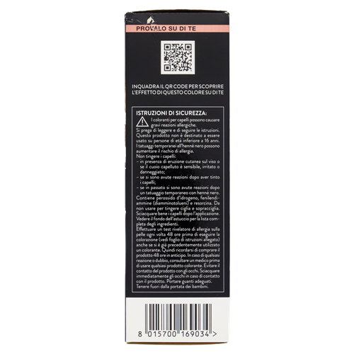 Effettuare un test rivelatore di allergia sulla pelle ogni volta 48 ore prima di eseguire la colorazione (vedi foglio di istruzioni allegato) anche se si è già precedentemente utilizzato un colorante. Quindi ricordarsi di comprare il prodotto 48 ore in anticipo. In caso di qualsiasi reazione o dubbio, consultare un medico prima di usare qualsiasi prodotto colorante. Evitare il contatto del prodotto con gli occhi. Sciacquare immediatamente gli occhi in caso di contatto con il prodotto. Portare guanti adeguati. Tenere fuori dalla portata dei bambini.