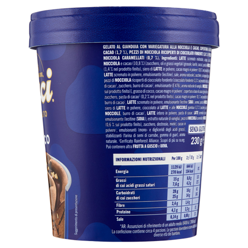 Gelato al gianduia con variegatura alla nocciola e cacao, copertura a base di cacao (1,7%), pezzi di nocciola ricoperti di cioccolato fondente (5,8%) e pezzi di nocciola caramellati (0,7%)